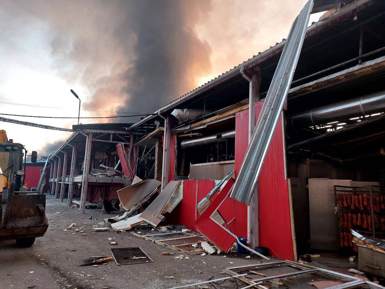 "1:40 8 марта Богодуховский р-н, г. Богодухов. В результате попадания четырех БпЛА (типа "Шахед") на территории мясокомбината возник пожар и повреждены производственные цеха, гаражи", - написал Синегубов.