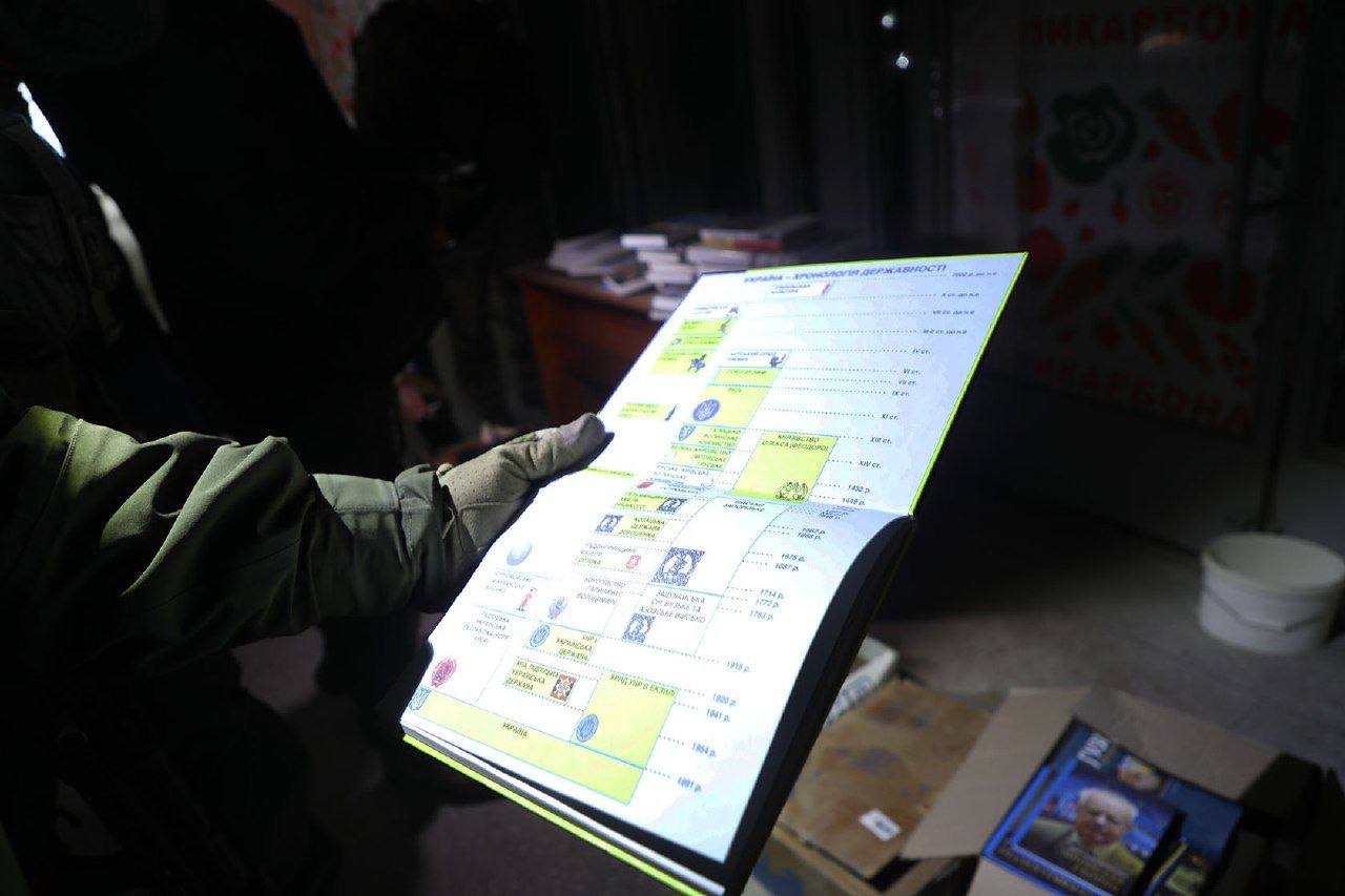 По словам российских силовиков, во время обысков в заброшенных школах и библиотеках одного из "освобожденных" населенных пунктов обнаружено огромное количество изданий, якобы "искажающих исторические факты" и "пропагандирующих деятельность запрещенных организаций". В частности, речь идет о произведениях, подчеркивающих важность независимости Украины, ее национальных символах, героях и событиях, ставших важными в истории борьбы за независимость.