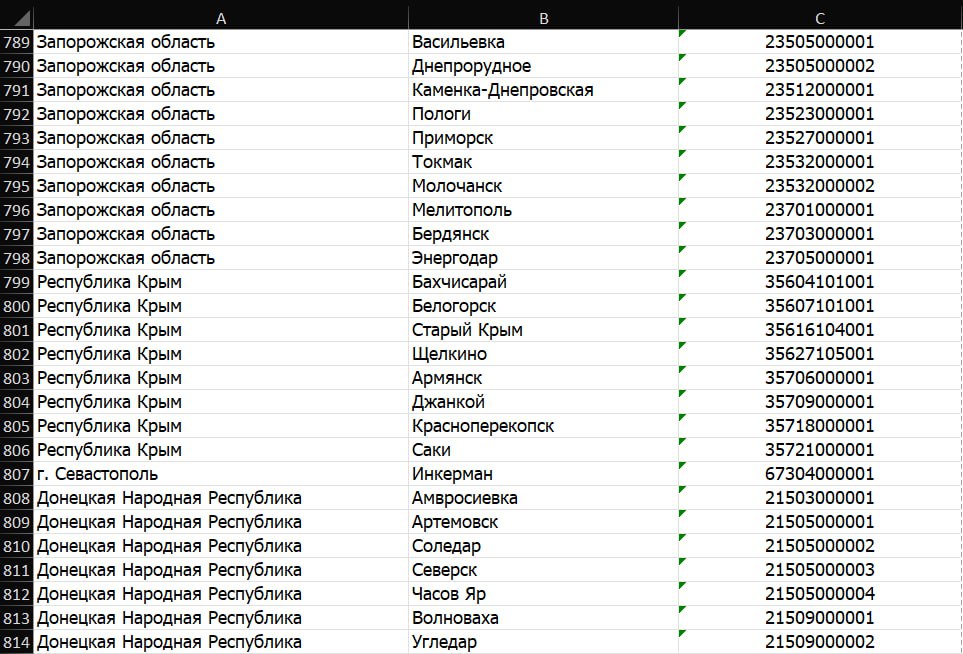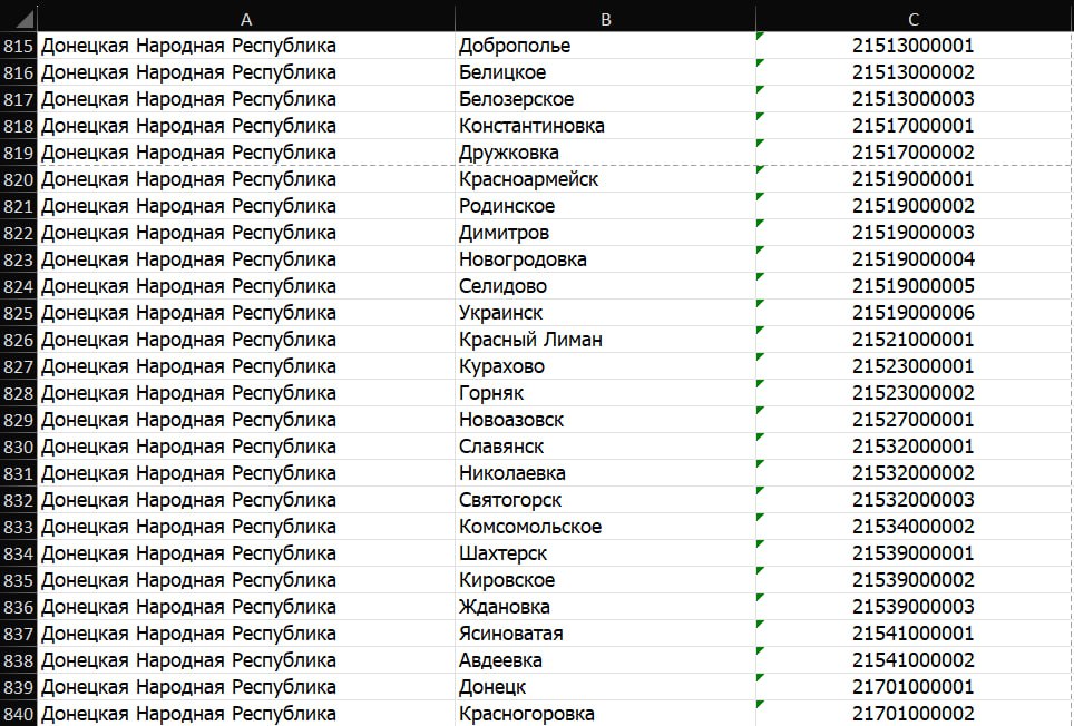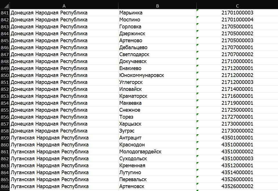 В перечень вошли города, которые Россия оккупировала: Угледар, Бахмут (Артемовск), Соледар, Селидово, Лисичанск, Северодонецк, Попасная, Геническ, Новая Каховка и другие. Однако в список включены и города, которые находятся под контролем Украины, в частности Красноармейск, Покровск, Часов Яр, Краматорск, Славянск, Красный Лиман, Херсон и т.д.