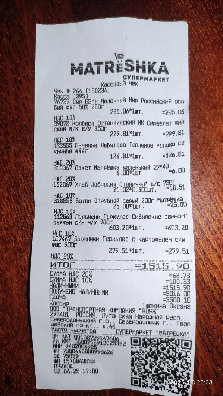 В сети показали чек из супермаркета "Матрешка" в Северодонецке, передает Час Пик.