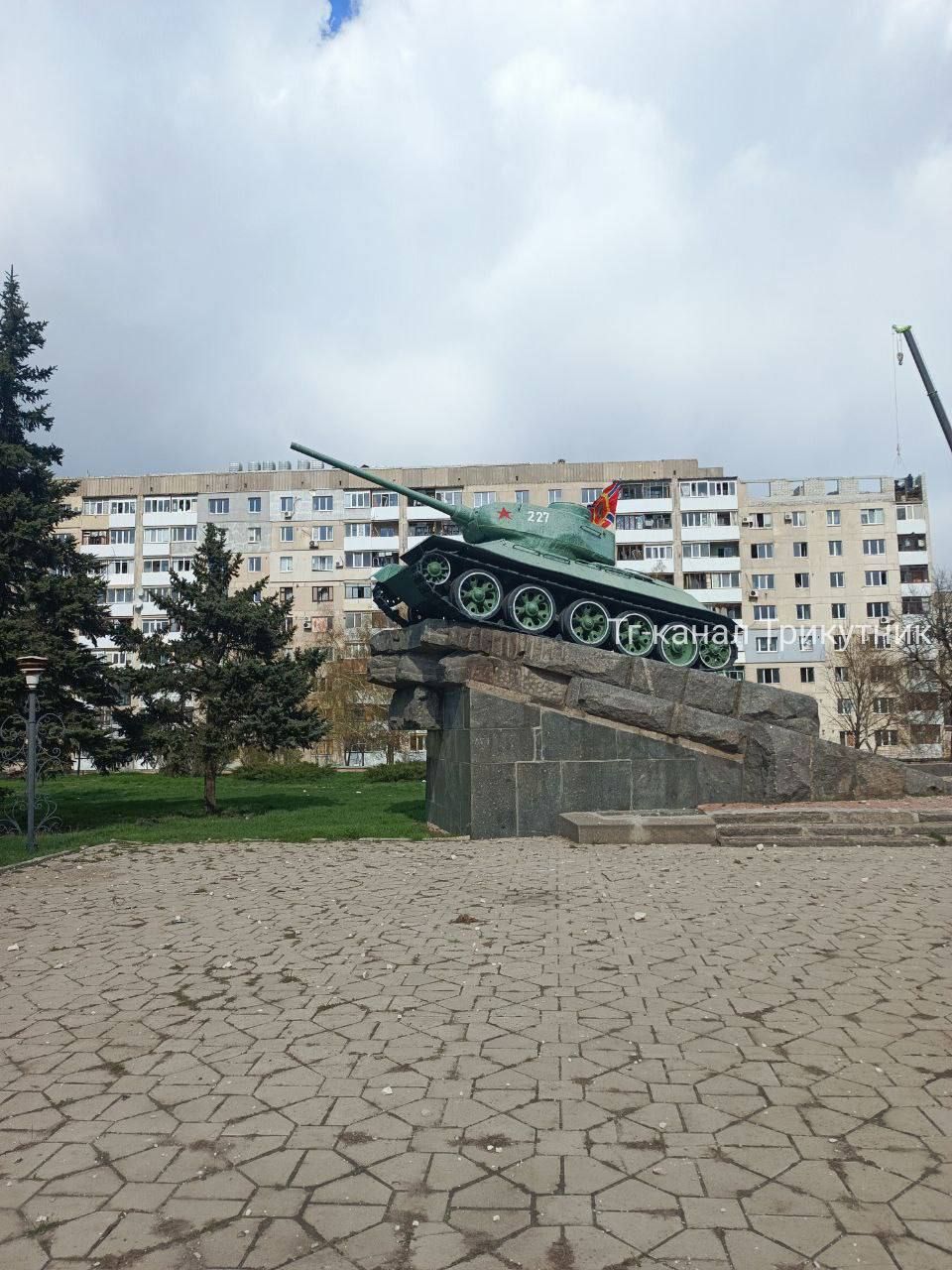 - В районе РТИ, среди разбитых жилых домов, установлен памятник — типичный для оккупантов символ "освобождения", удивительно контрастирующий с фоном тотального разрушения.