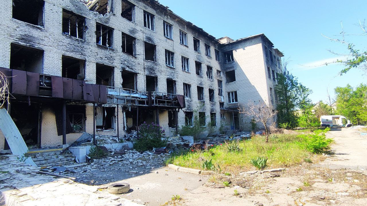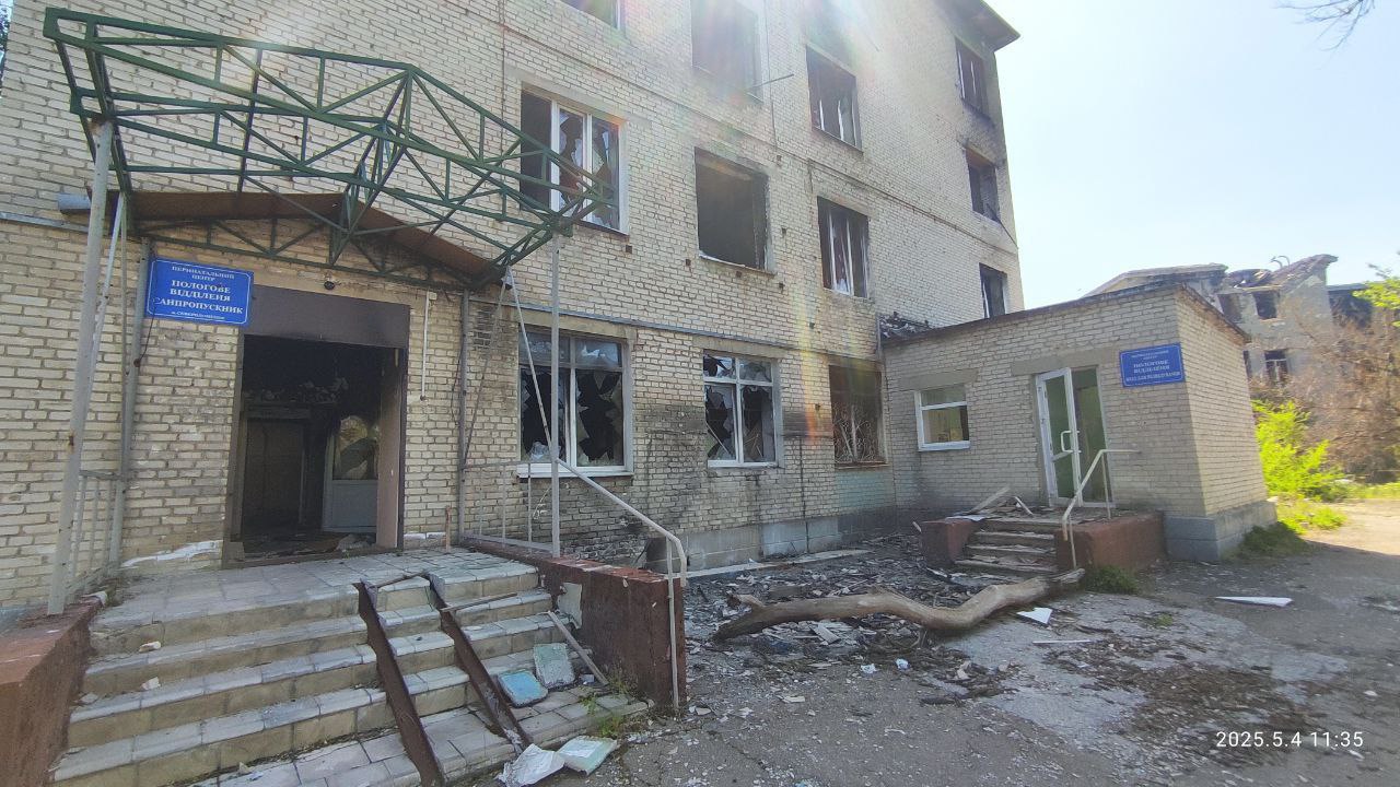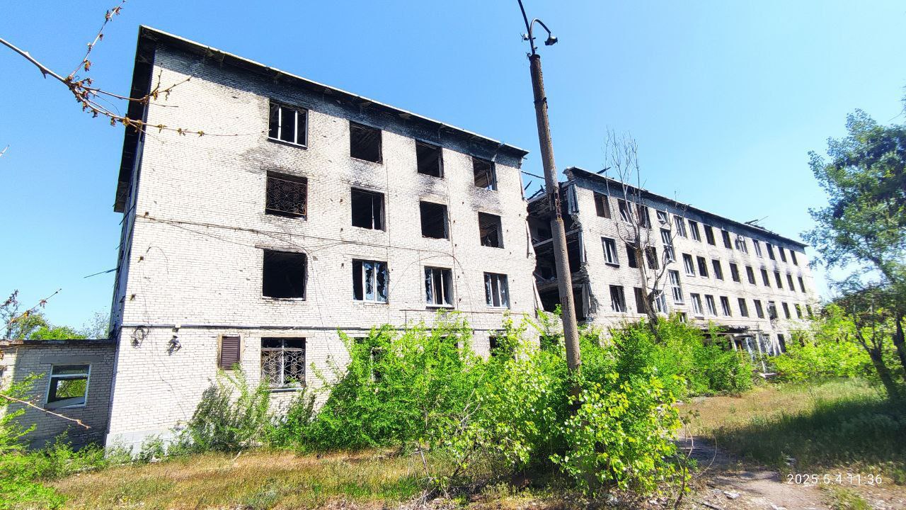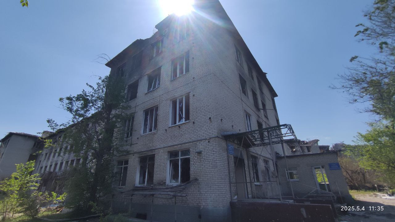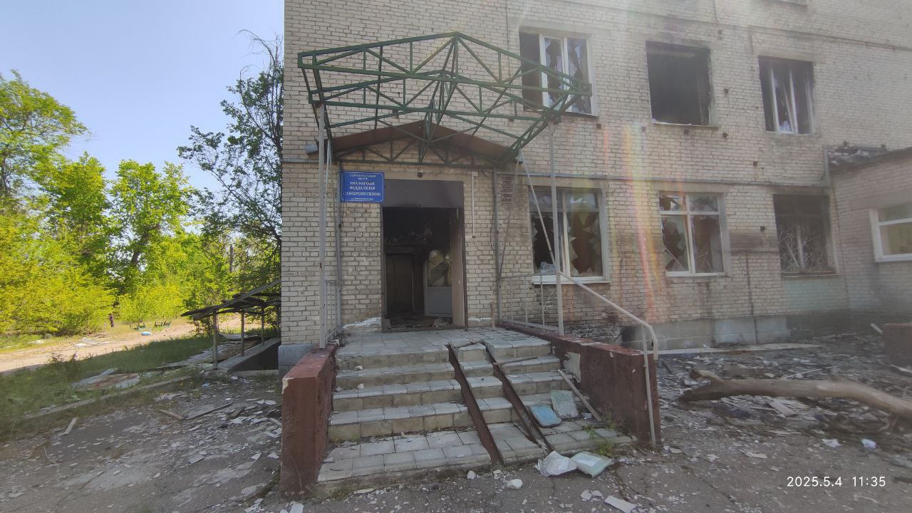 Фото датированы маем 2025 года. Как можно заметить, здание сильно повреждено. Очевидно, что с момента оккупации никто им не интересовался, никто не пытался навести порядок. На территории вокруг здания растут бурьян и молодые деревья. В скором времени вход в здание совсем утонет в кустах.