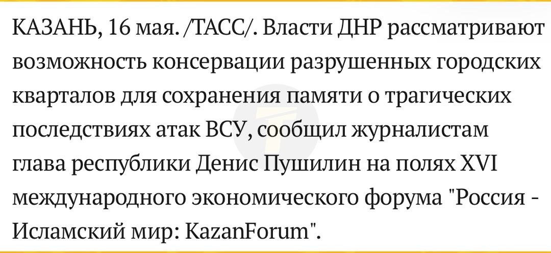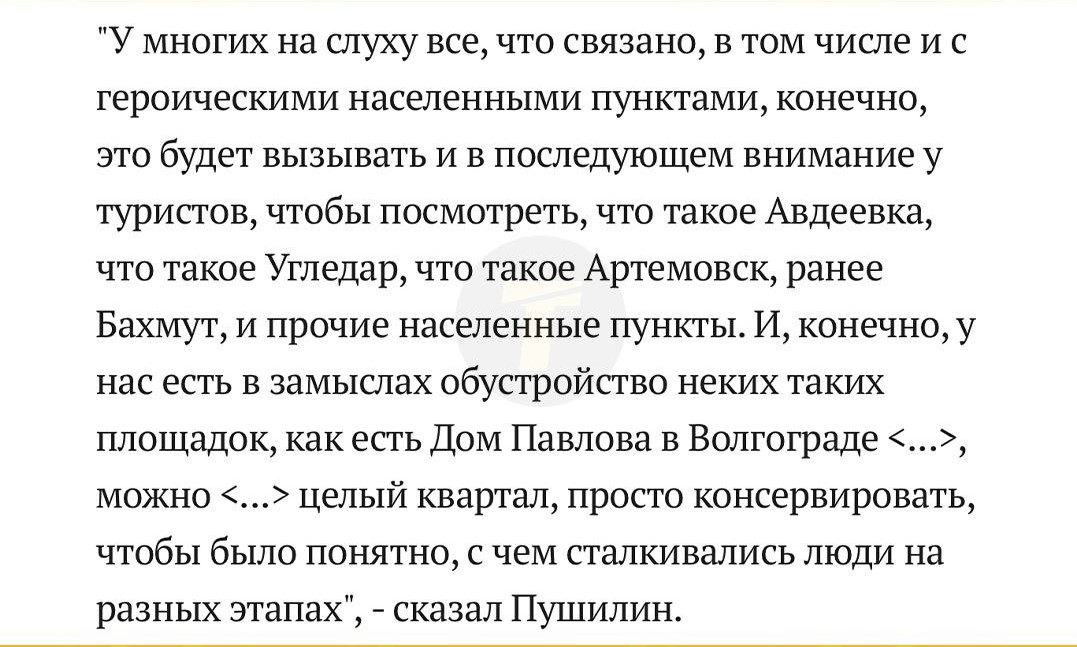 Пушилин сообщил, что речь идет о законсервированных руинах в Авдеевке, Бахмуте, Угледаре, Мариуполе и других населенных пунктах Донбасса, передает Час Пик.