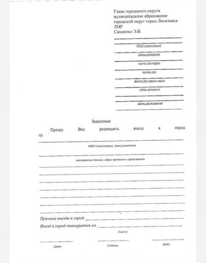 В сети также обнародовали форму, которую заполняют те, кому надо попасть в Лисичанск. Судя из этого “документа”, россиян интересуют паспортные данные заявителя, информация о регистрации и проживании. Также необходимо объяснять причину въезда и указывать точные даты въезда и выезда.