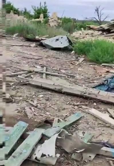 На дороге валяются обломки сбитых или поврежденных беспилотников, ранее использованных для разведки или корректировки огня.