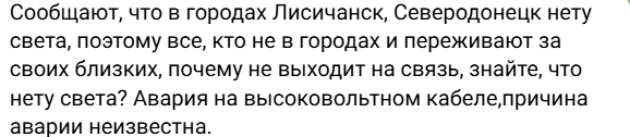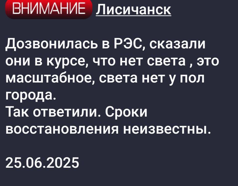 Ночью в Лисичанске пропало электричество, обесточенными оказались и районы Северодонецка. Оккупационные ресурсы признали: причина - авария на питающей подстанции, вероятно, вызванная последствиями ударов.