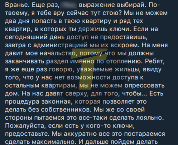 "Если на сегодняшний день доступ не предоставишь - завтра вскроем. На меня давит начальство. Мы не можем опрессовать дом, пока не получим доступ ко всем квартирам".
