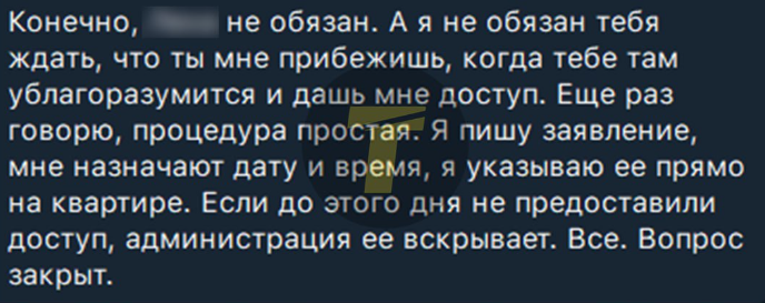"Мне не нужна твоя квартира, ни сантиметра… но я пишу заявление, назначают дату, и если доступа нет - вскрывают. Всё. Вопрос закрыт".