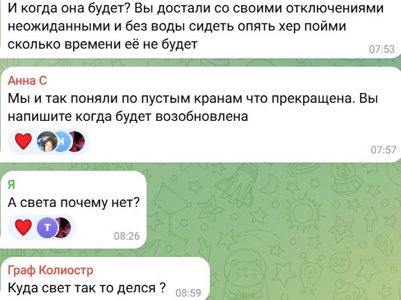 "И когда она будет? Вы достали со своими отключениями неожиданными и без воды сидеть опять не пойми сколько времени",
