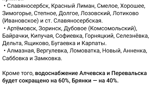 Тем временем жители региона сталкиваются и с другой проблемой. Оккупационная администрация сообщила, что с 19 августа почти 30 населенных пунктов Луганщины останутся без воды. Причина - обесточивание насосных станций в районе Алчевска.