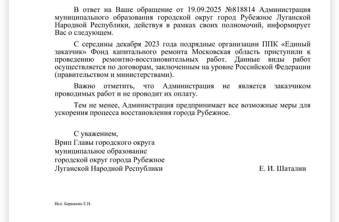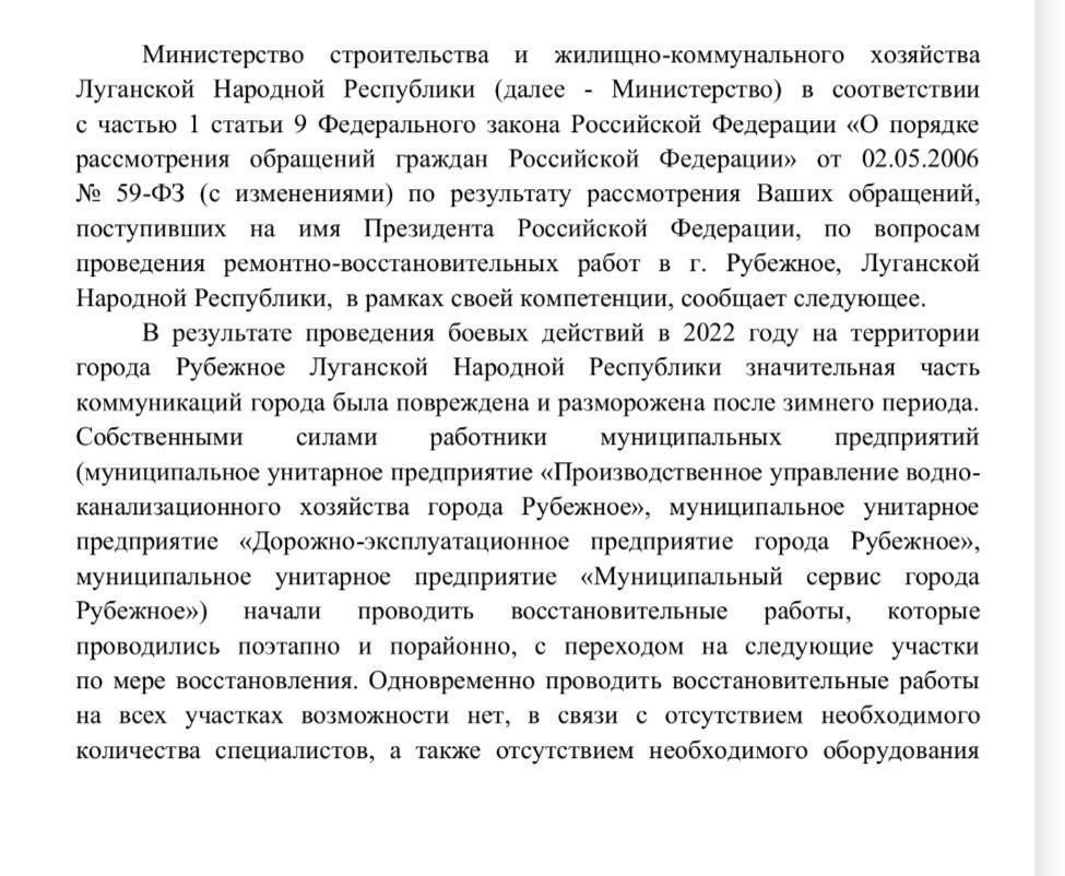Таким образом, официальный ответ подтверждает, что большинство запланированных восстановительных работ в Рубежном заморожены или отложены, а объемы фактически выполненных работ остаются ограниченными.