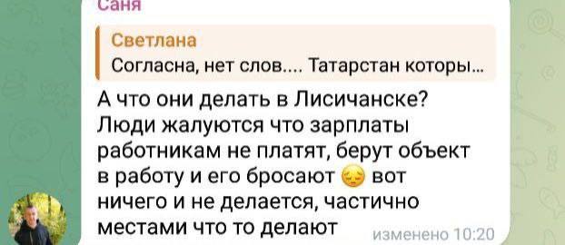 На оккупированных территориях Луганщины усиливается недовольство даже среди сторонников так называемых «новых властей». В сети появился скрин переписки, где жительницы региона открыто обсуждают, что Татарстан, который «взял шефство» над Лисичанском и Рубежным, фактически бросил один из городов на произвол судьбы.