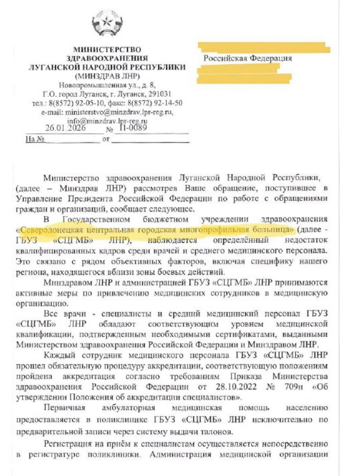 В ответ на обращение "Минздрав ЛНР" сообщил, что в многопрофильной больнице фиксируется дефицит кадров среди врачей и среднего медицинского персонала. Но якобы для того, чтобы хоть как-то его покрыть, приезжают врачи из Луганска и регионов РФ.
