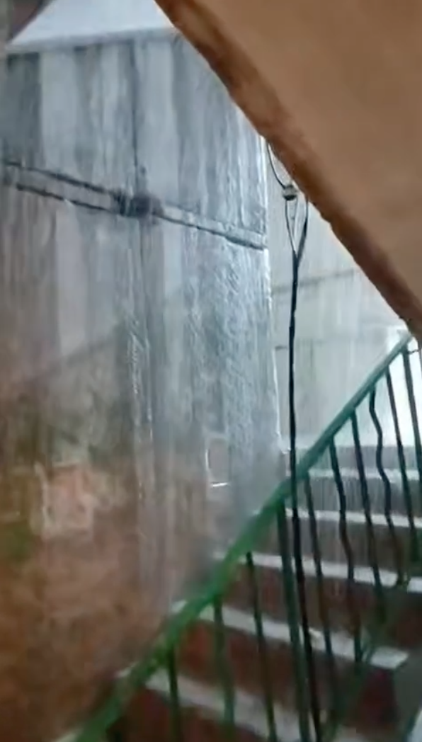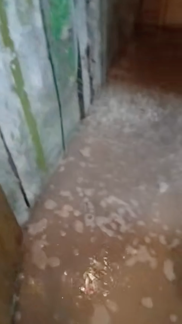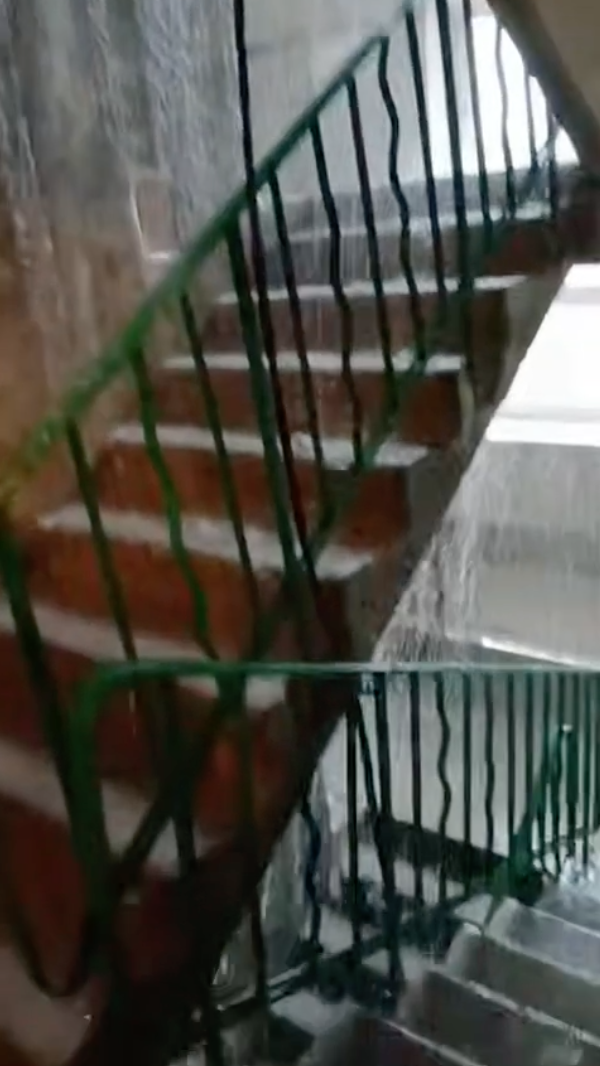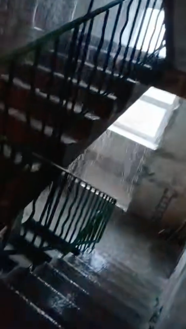 Выходя их квартиры, теперь можно нарваться на ливень. В подъезде одного из домов Северодонецка грандиозный потоп. Очевидно, что крышы в доме нет вообще. Поэтому вода льется как из ведра. Мощные потоки стекают по этажам, льются рядом с электрическим счетчиком.