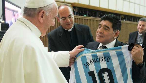 Марадона дал своему соотечественнику майку сборной Аргентины. Рубашка числом 10, под которым играл футболист, и в испанской транскрипции -имени Святого Отца.<