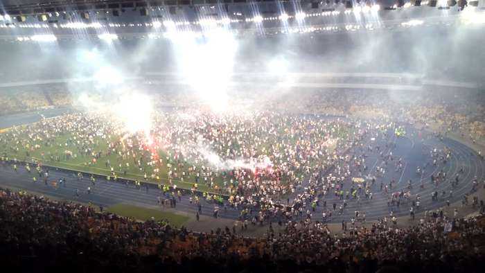 Фанаты на южной стороне «Олимпийского» разбили ворота, разрезали на сувениры сетку ворот, фотографировались на скамейке запасных, не реагируя ни на какие призывы покинуть поле.