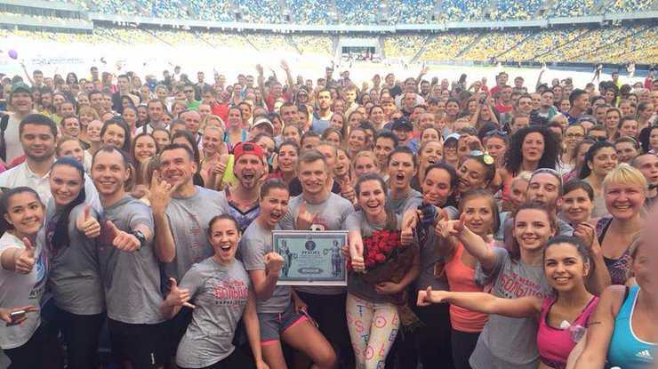 В Киеве на стадионе Олимпийский прошла самая масштабная кардио-тренировка в которой принимает участие одновременно 1062 человека. Участники активно прыгаюь, отжимаются, приседают и качают пресс.