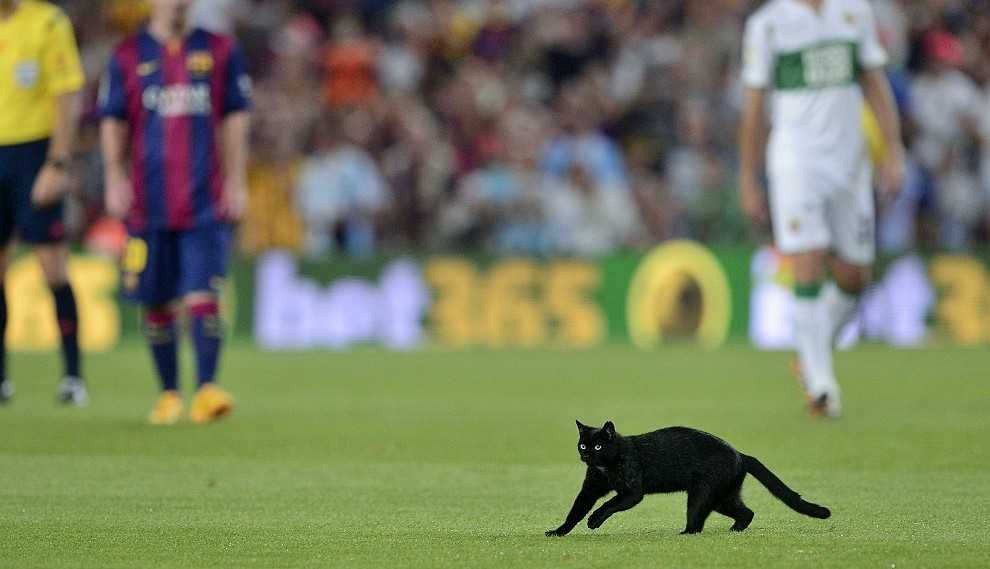 Подобный случай произошел 24 августа текущего года на матче испанского чемпионата между «Барселоной» и «Эльче». Черный кот выскочил на поле уже на первой минуте игры. Матч тоже остановили, и еще несколько минут безрезультатно гонялись за котом по полю.