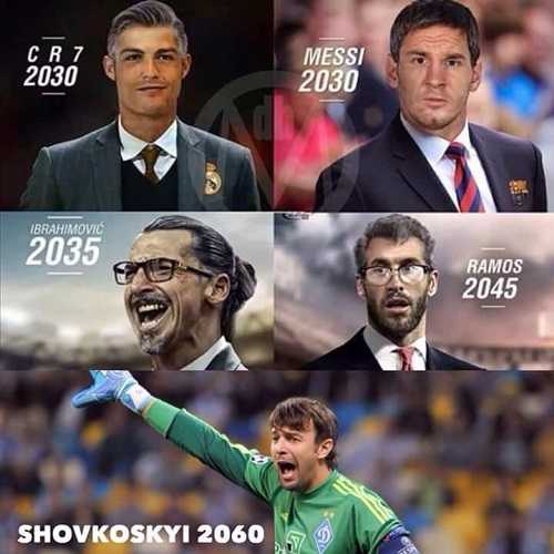 На фото изображены знаменитые футболисты в будущем. Автор фото изобразил Криштиану Роналду и Лионеля Месси в 2030 году. Златан Ибрагимович изображен в 2035 году, Серхио Рамос в 2045-ом. Все они несколько «изменились». А вот вратарь футбольного клуба «Динамо» Александр Шовковский, чье фото подписано 2060-м годом ничуть не изменился.