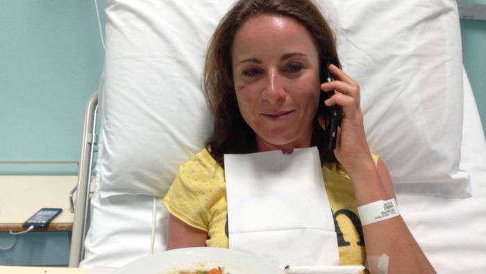 Из-за скользкой после недавнего дождя дороги, на спуске она вылетела с велосипеда. У 33-летней спортсменки сломан позвоночник. Момент головокружительного падения попал на видеокамеры.