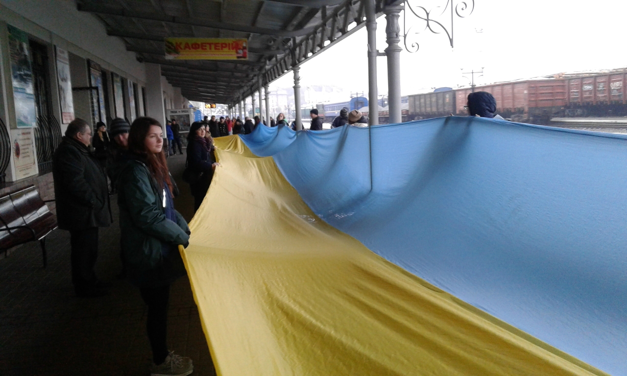 Поезд единения «Труханівська січ» прибыл в Черновцы 26 октября. Этим дождливым, но теплым утром нас встречали представители местного и студенческого самоуправления. Прямо на вокзале горожане растянули большой 25-метровый флаг. На каждый юбилейный год независимости Украины его увеличивают на пять метров.