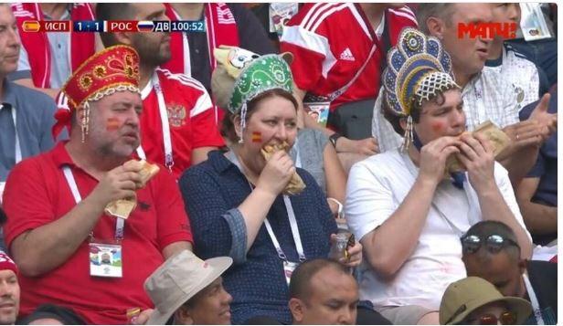 Болельщики сборной России на матче с Испанией прославились на весь мир. Женщина и двое мужчин пришли на стадион в кокошниках, а в разгар игры сидели со спокойными лицами и жевали хот-доги.