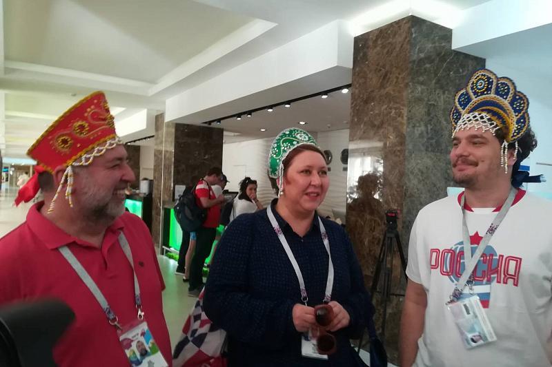 Трио болельщиков в кокошниках, которые уже успели стать своеобразными "знаменитостями" ЧМ-2018, приехали в Сочи на матч 1/4 финала Россия-Хорватия.