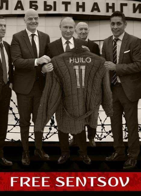 В сети появилась фотожаба с изображение президента РФ Владимира Путина в Лабытнанги, где удерживается украинский политзаключенный Олег Сенцов. Российскому лидеру "вручают" одежду с оскорбляющей надписью.
