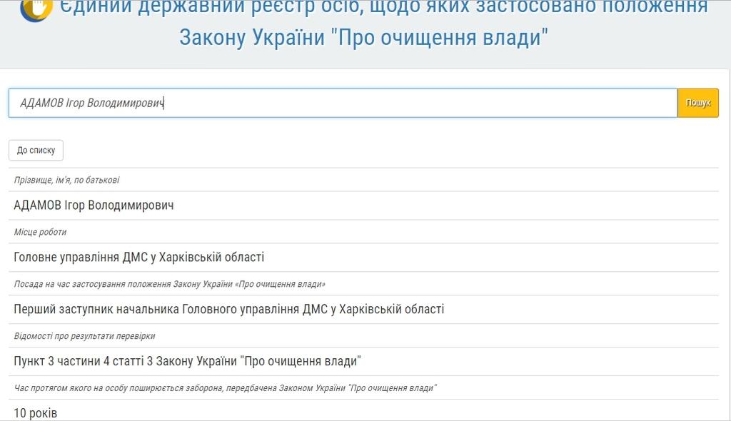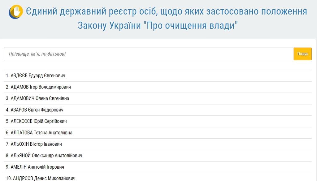 - Единого государственного реестра лиц, в отношении которых применены положения Закона Украины "Об очищении власти"