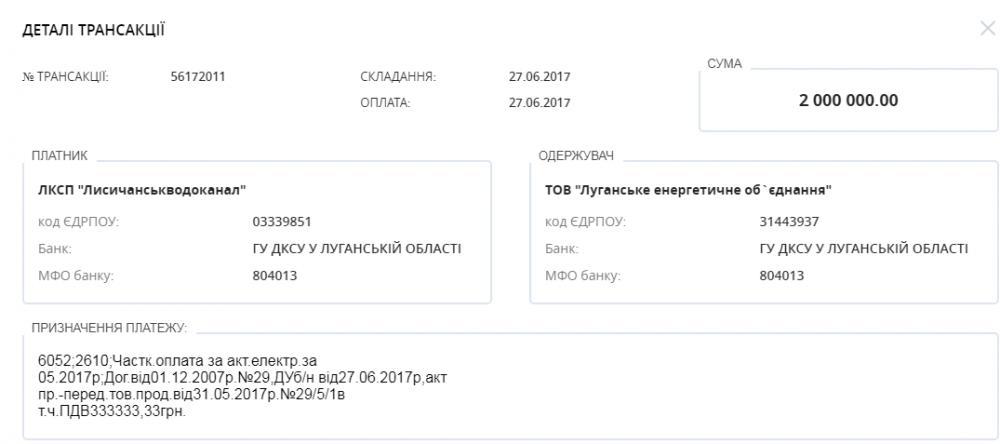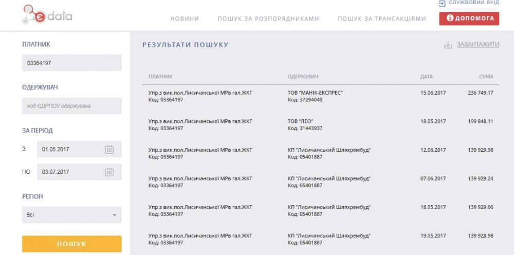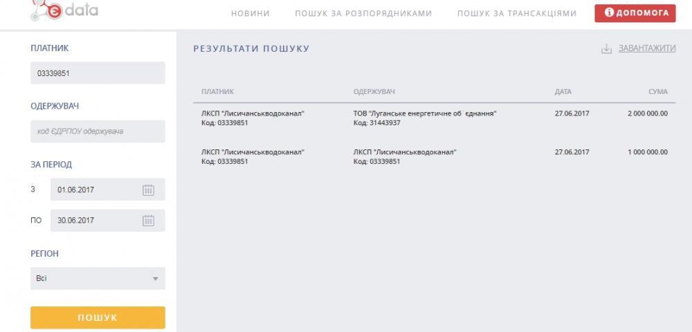 Для примера, поищем уплатил ли КСП «Лисичанскводоканал», обещанные ТОВ «ЛЭО» 3 млн.грн. для того, что бы 3 июля 2017 года его не отключили от электроэнергии. Вводим код ЕГРПОУ водоканала и период. Получаем список