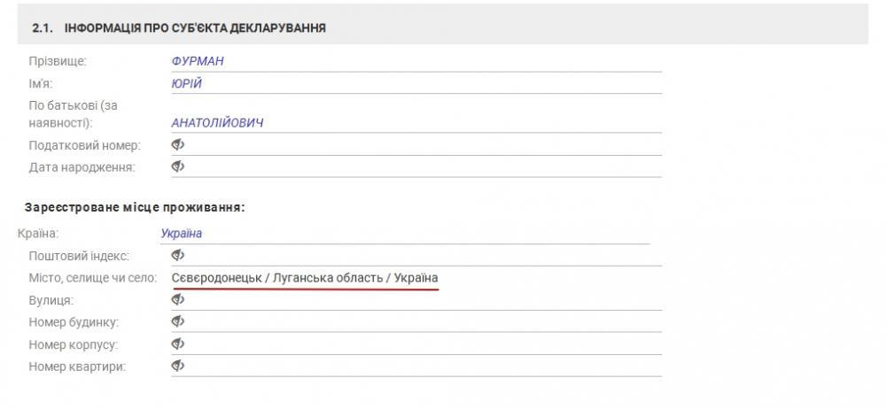 По сути, сюда вписывается место фактического проживания. Например, депутат Юрий Фурман зарегистрирован в Кадиевке, а фактически проживает в Северодонецке. Но жилье у него есть только в Кадиевке. А где он живет в Северодонецке?