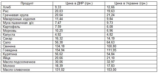 Продукт | Цена в «ДНР» (грн.) | Цена в Украине (грн.) |