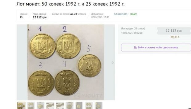 Наприклад, власник монети номіналом в 1 гривню продав її за 15,6 тисяч гривень. Ставки по даному лоту, як зазначається, підвищувалися 77 разів.