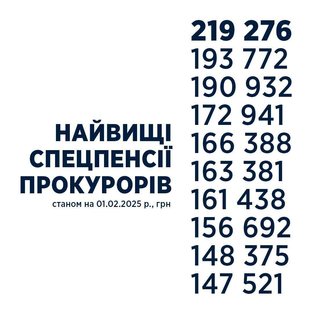- Прокурори — найбільша пенсія в цій категорії — 219 тис. грн, інші з ТОП-20 — від 119 тис. грн. Загалом середній розмір "спецпенсій" для 5851 особи становить 21,9 тис. грн.
