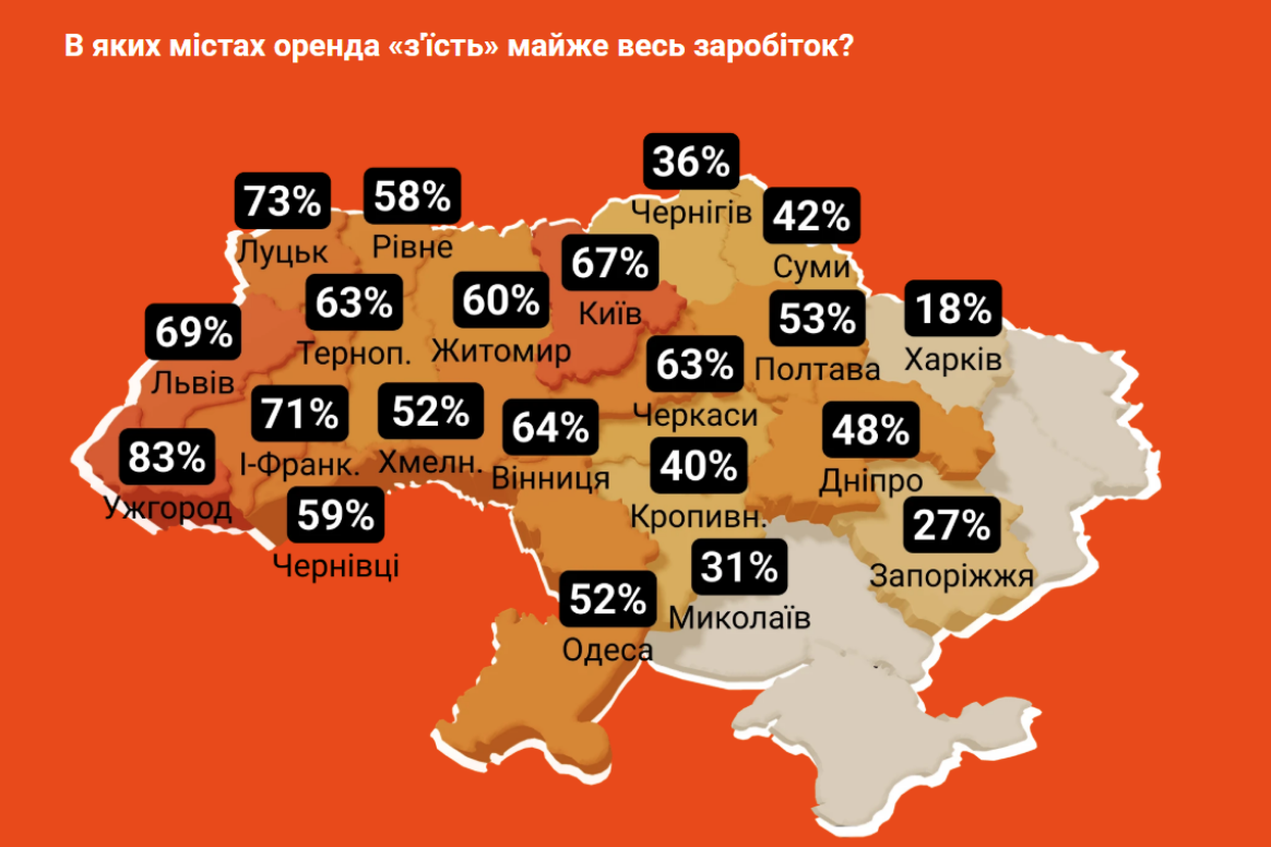 Значно легше знімати житло у східних та південних областях. У Харкові оренда "з'їдає" лише 18% середньої зарплати, у Запоріжжі - 27%, у Миколаєві - 31%.