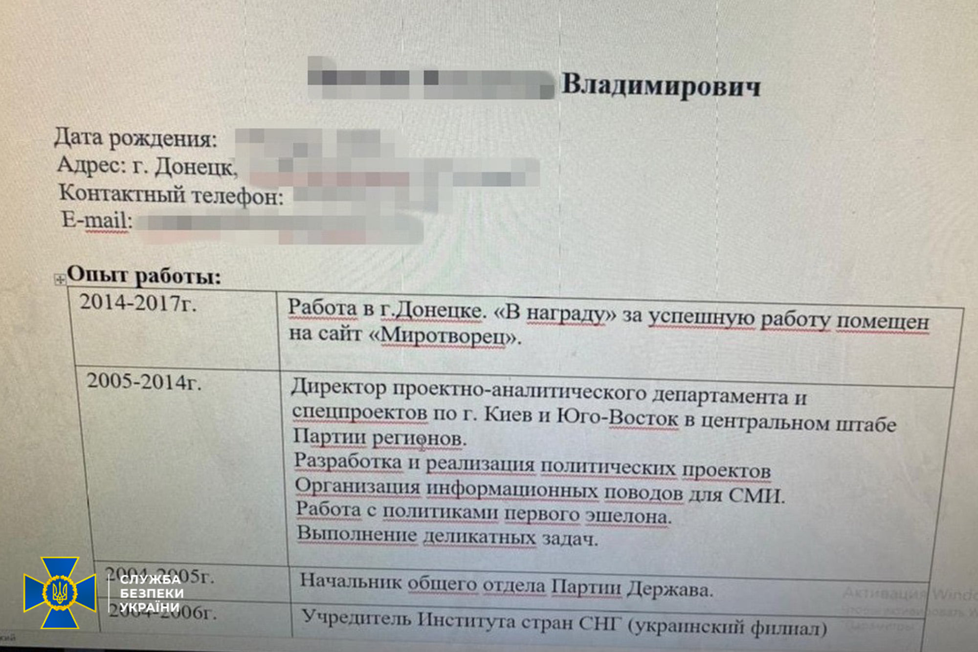 Співробітники спецслужби задокументували, що через деякий час екс-заступник "міністра" через РФ повернувся на підконтрольну українській владі територію поза встановленими пунктами пропуску. У Києві зловмисник відразу почав працювати політтехнологом та піарником проросійських громадсько-політичних структур.