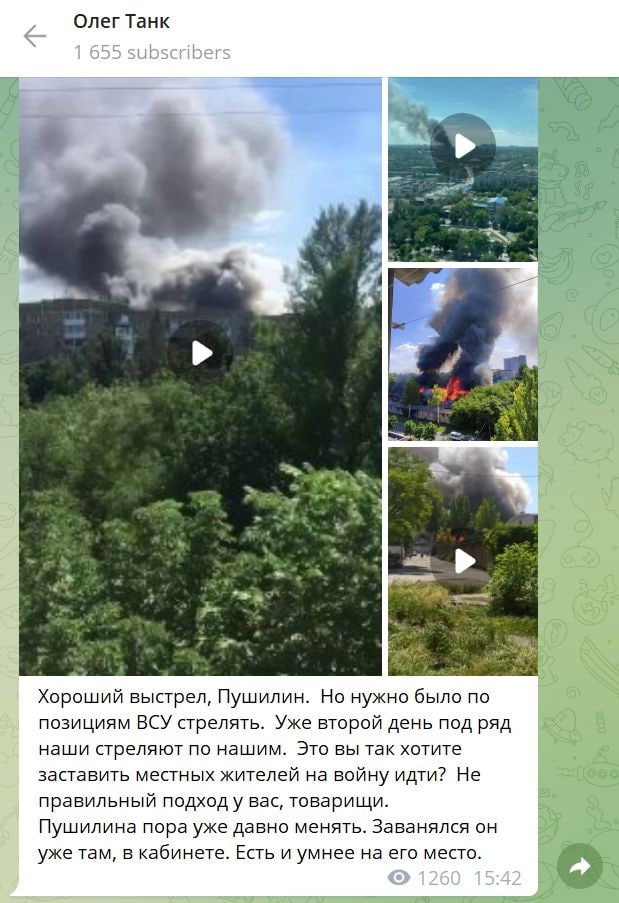 Раніше центральні райони Донецька були обстріляні з РСЗВ увечері 4 червня . Окупанти, звісно ж, звинуватили в обстрілі Україну, хоча багато місцевих жителів стверджують, що обстріл вівся з боку окупованої Макіївки.
