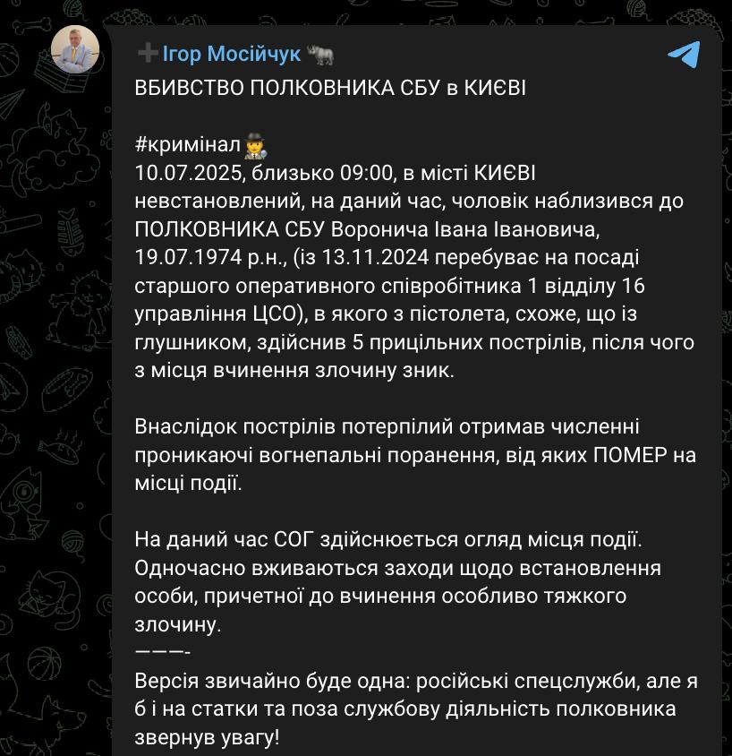 Вранці 10 липня в Голосіївському районі Києва пролунали постріли - невідомий відкрив вогонь по чоловікові, який, як з'ясувалося, виявився чинним полковником Служби безпеки України. Потерпілий загинув на місці, а вбивця встиг зникнути. Наразі у столиці оголошено план-перехоплення.