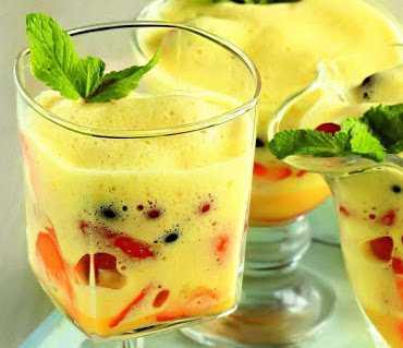 - Покладіть в келихи шматочки фруктів і викладіть зверху приготований крем.