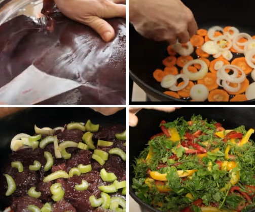 На початку потрібно очистити печінку від плівки - робиться це легко, якщо підчепити плівку гострим ножем. Почистили і поки відставили в сторону. Беремо весь лук і нарізаємо кільцями товщиною приблизно 5 мм, моркву нарізаємо також кільцями. Наливаємо в казан на дно зовсім небагато рослинної олії. Далі на все дно укладаємо моркву, зверху викладаємо кільця цибулі. Печінку нарізаємо середніми шматочками і також викладаємо наступним шаром. Нарізану селеру відправляємо зверху на нашу печінку, потім гарненько присолюємо і перчимо.