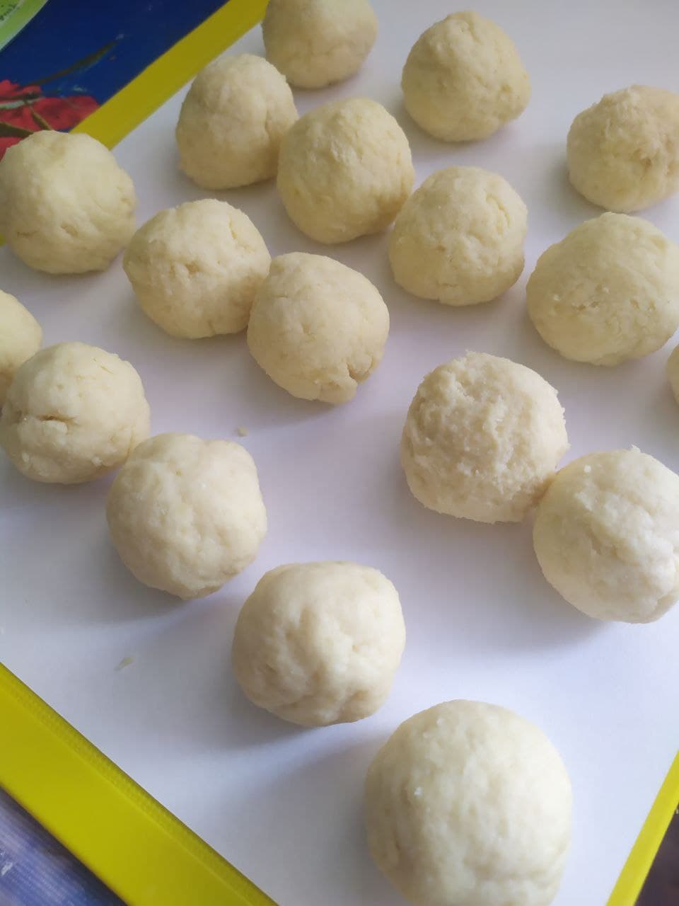 Коли все буде готово, з отриманої маси слід сформувати невеликі кульки. Вони повинні бути менше волоського горіха, бо під час готування вироби збільшаться в кілька разів.