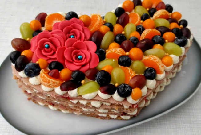 Цей неймовірно барвистий, дуже смачний тортик з фруктів і фруктових коржів у вигляді серця, з додаванням шоколадно-вершкового крему надихне будь-кого. Це романтичне, просте у приготуванні блюдо можна піднести як подарунок мамі, коханій подрузі, а також до Дня святого Валентина.
