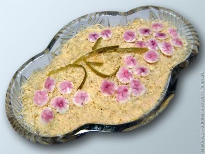 - Перекладіть в салатник, зверху натріть сир та прикрасьте «гілкою сакури»: покладіть «квіточки» з білка і пензликом розфарбуйте їх буряковим соком, а гілочки зробіть з солоного огірка або пір'я зеленої цибулі.