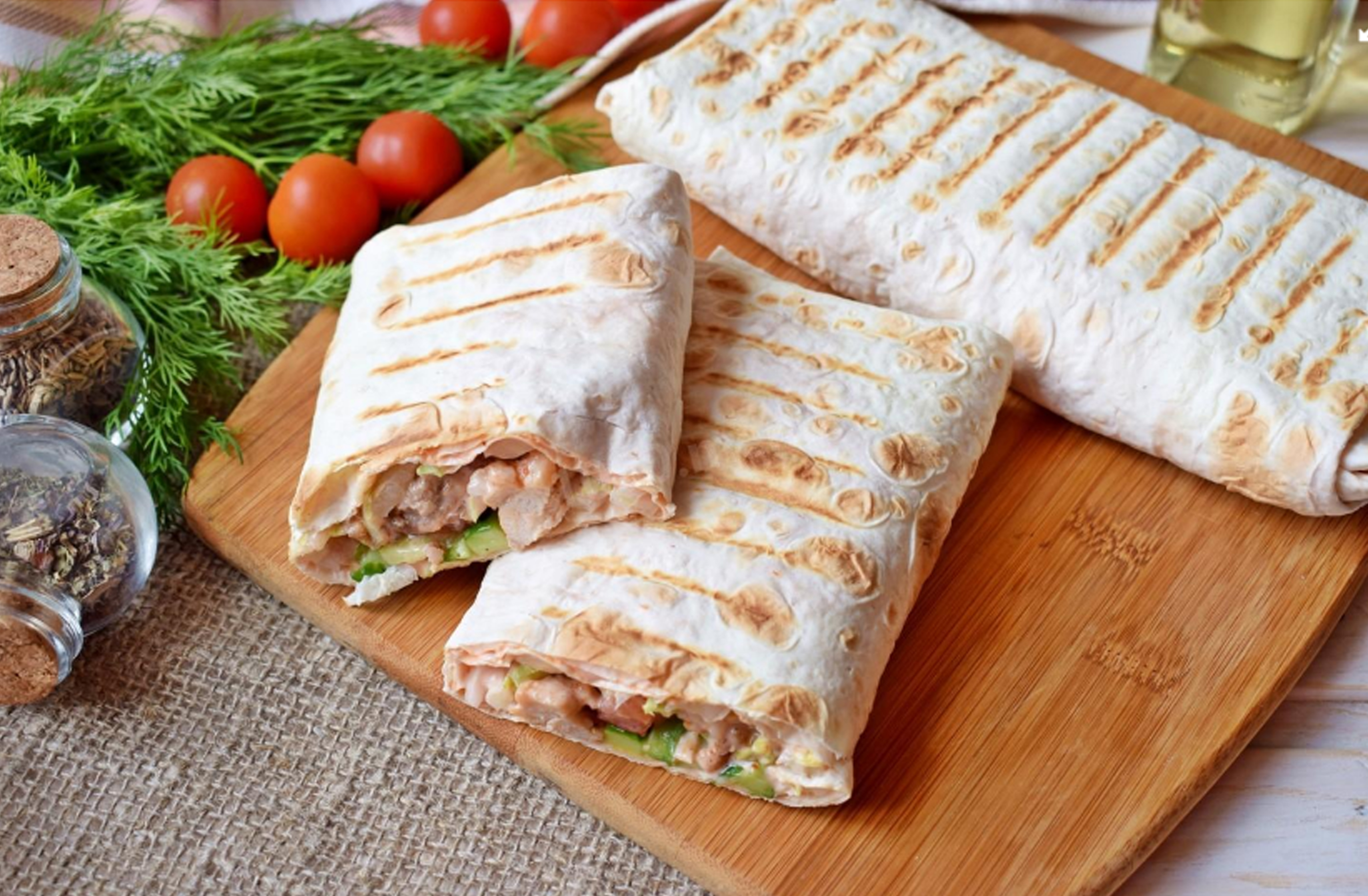 - Готову шаурму обсмажте на сухій пательні або грилі з двох сторін.