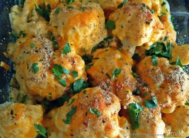 - Помістіть суцвіття цвітної капусти в жаростійку форму, посипте зверху невеликою кількістю сиру (приблизно 1/3), залийте зверху соусом і посипте зверху сиром, що залишився.