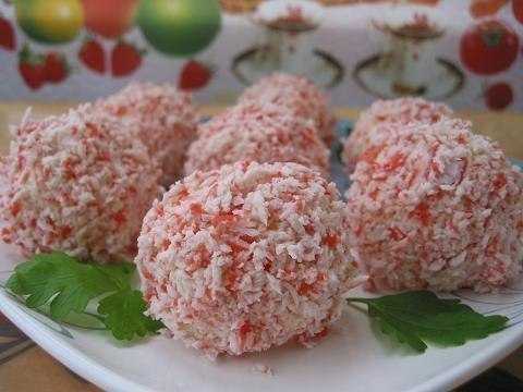 - З сирної маси мокрими руками сформуйте кульку, розімніть її в коржик, покладіть оливку і знову скачайте кульку, потім обваляйте її в крабових паличках.