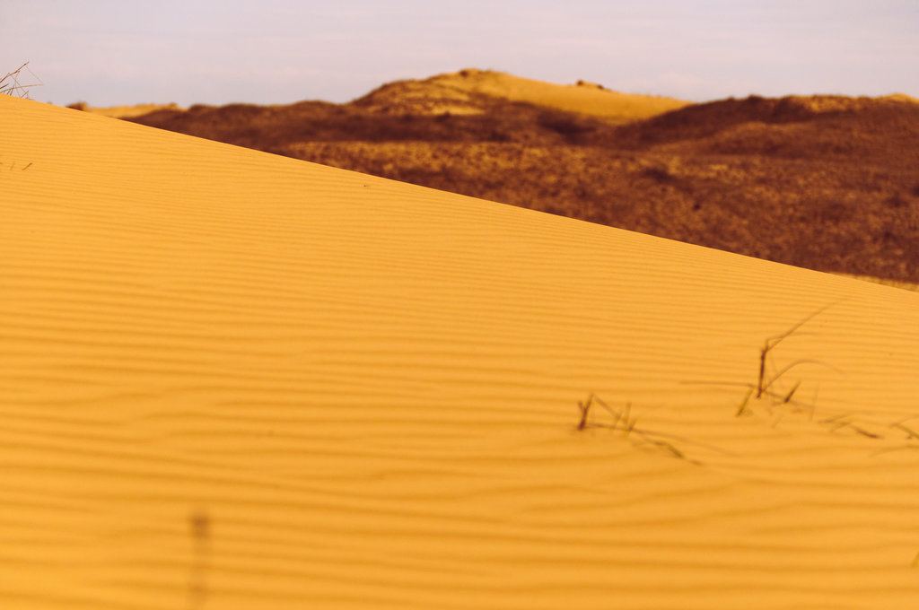 Складаються вони із безмежних барханів (тутешні мешканці називають їх «кучугурами»), висотою близько 5 м, і негустою рослинністю. Стримують пустелю, яка в діаметрі має розмір близько 15 км, штучно насаджені густі ліси.
