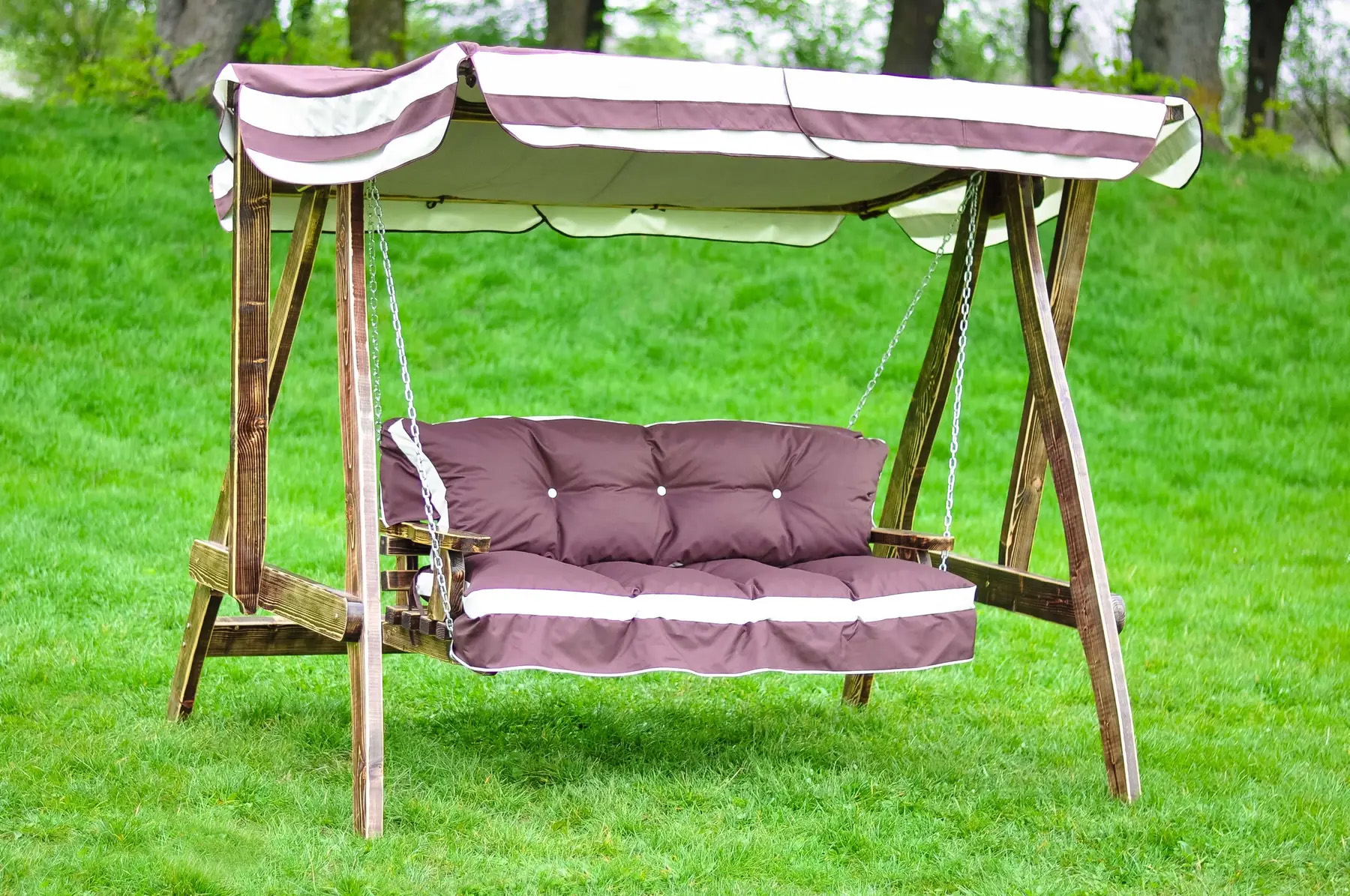 Гойдалки з дерева також відзначаються стилем і універсальністю. Вони органічно доповнюють будь-який садовий інтер’єр, підходячи як для просторих ділянок, так і для невеликих затишних куточків.