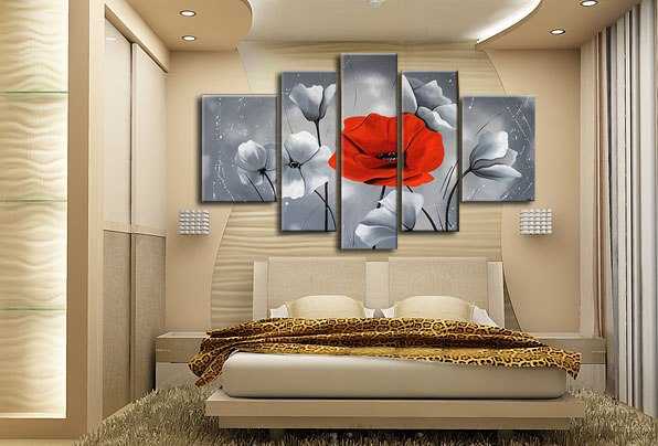 Якщо вікна вашої спальні виходять на південну сторону і за вікном мальовничий пейзаж, то він цілком може замінити вам картину. Якщо ж вікна виходять на північ, то добре б наповнити простір красивими картинами з позитивним змістом або абстракціями з яскравими соковитими фарбами. До речі, це можуть бути не тільки мальовничі полотна, а й картини з тканини, а також виконані вашими руками колажі та панно. Адже речі, зроблені своїми руками, віддають ті позитивні емоції, які відчувала людина, створюючи свій шедевр.