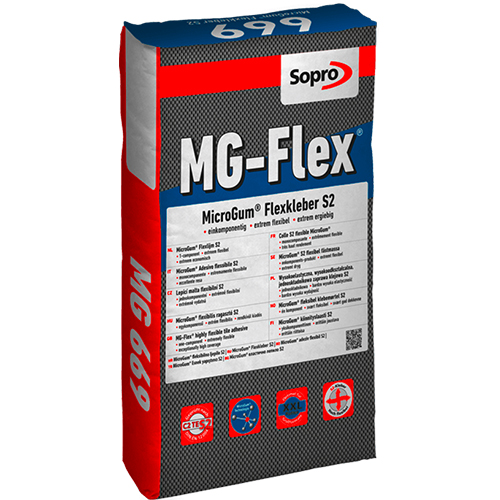 Клейова суміш Sopro MG-FLEX 669 – високоякісний тонкошаровий та дуже гнучкий однокомпонентний клей, який виготовляється на основі цементу. Ця клейова суміш розроблена спеціально для укладання плиток великого формату XXXL. Цей клей відмінно підходить для облицювання поверхонь скляною плиткою, керамогранітом, природним камінням, литою кам’яною плиткою.